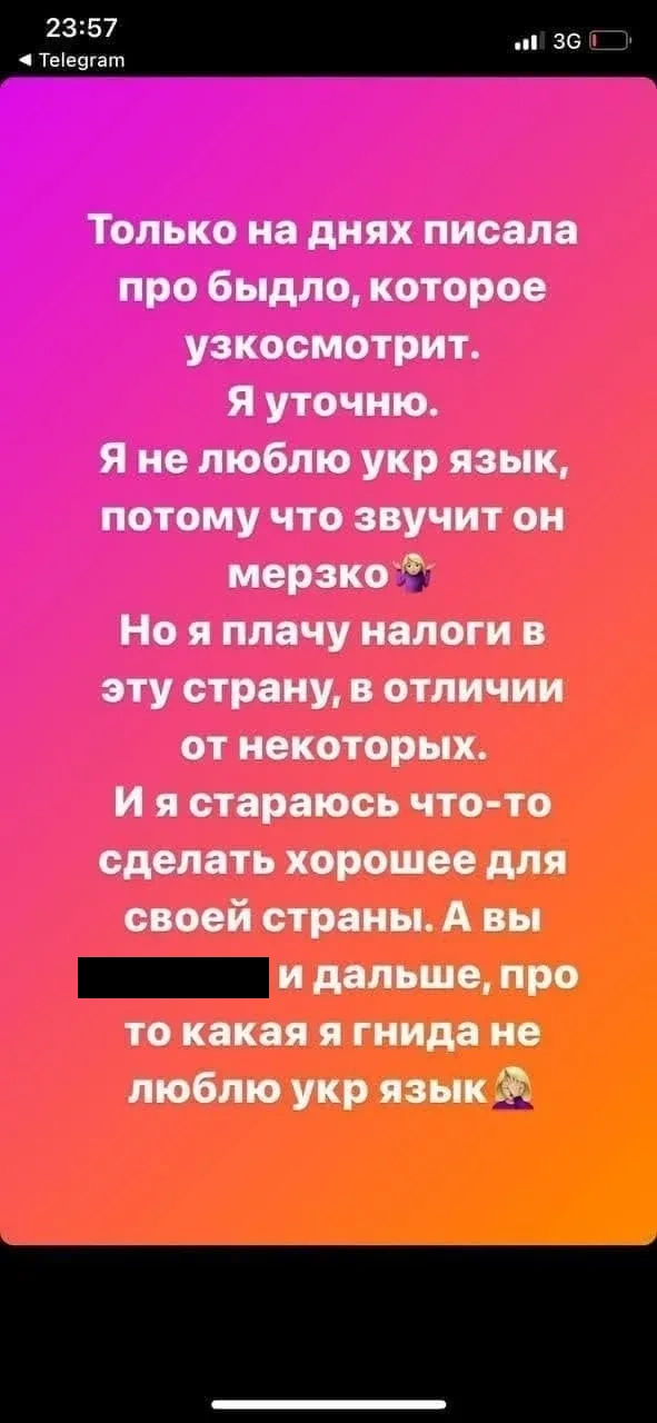 Тем не менее блогершу Анастасию Польских такое положение дел, видимо, не устроило, и она высказала в Stories на своей странице в Instagram, все что думает по этому поводу. В них она также включила видео, опубликованное на страницах в соцсетях уполномоченного по защите украинского языка Тараса Кременя, причем девушка не выбирала выражений в адрес языка.