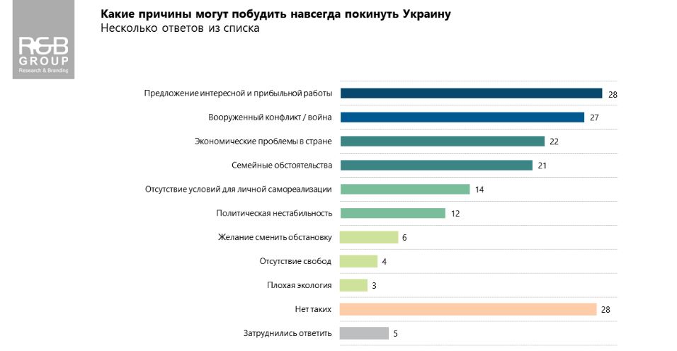 Основным фактором вероятного переезда для украинцев остается более прибыльная занятость (28 %). В связи с войной страну желают покинуть 27 % респондентов. Также на миграционные настроения граждан влияют экономические проблемы (22 %) и семейные причины (21 %). Свыше четверти украинцев (28 %) и вовсе не имеют поводов для вынужденного переезда.