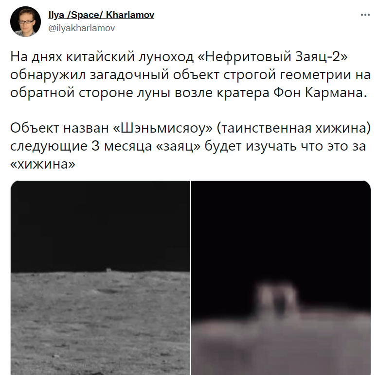 "У нас есть обновленная информация от "Юйту - 2" с обратной стороны Луны, включая изображение кубической формы на северном горизонте в ~ 80 м от лунохода в кратере Фон Карман. Назван "таинственный дом", следующие 2-3 лунных дня будут потрачены на то, чтобы поближе его проверить", - пишет журналист.