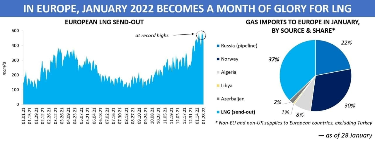 Аналитики сообщают, что по итогам января 2022 года в ЕС могут прийти рекордные 10,36 млрд кубометров СПГ. Прошлый рекорд был в ноябре 2019 года – 9,9 млрд кубометров газа.