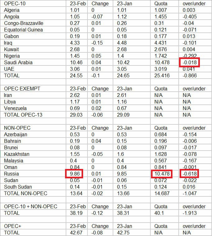 Таким образом, добыча сократилась на 0,618 млн баррелей. Это наибольший показатель среди всех участников картеля. Например, в Азербайджане добыча в прошлом месяце сократилась на 0,154 млн баррелей, в Казахстане - на 0,078 млн, в Малайзии - на 0,167 млн, в Судане - на 0,022 млн, в Нигерии - на 0,292 млн, в Саудовской Аравии - на 0,018 млн, в Анголе - на 0,405 млн. В целом добыча в ОПЕК+ по итогам февраля сократилась на 1,913 млн баррелей.