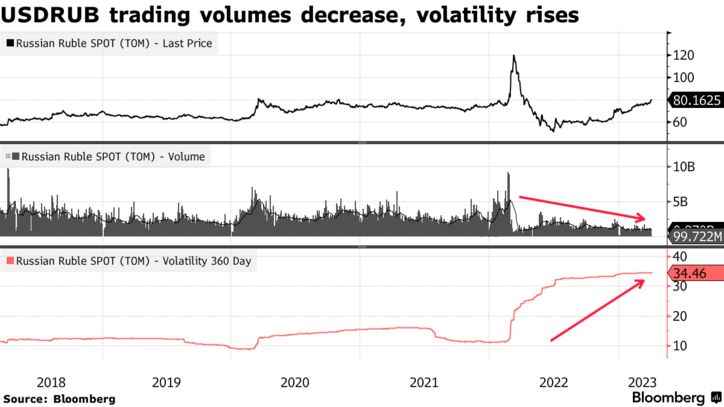 Bloomberg связывает такое падение с выводом компанией Shell прибыли от продажи своей доли в "Сахалине - 2". Агентство отмечает, что сумма сделки Shell и "НОВАТЭК" составляет всего около одной пятой от ежедневного объема торгов российской валютой до начала войны. Однако за 2022 год ежемесячные объемы торгов в паре "рубль - доллар" упали примерно на 75%, в то время как объемы торговли юанем выросли примерно в четыре раза.