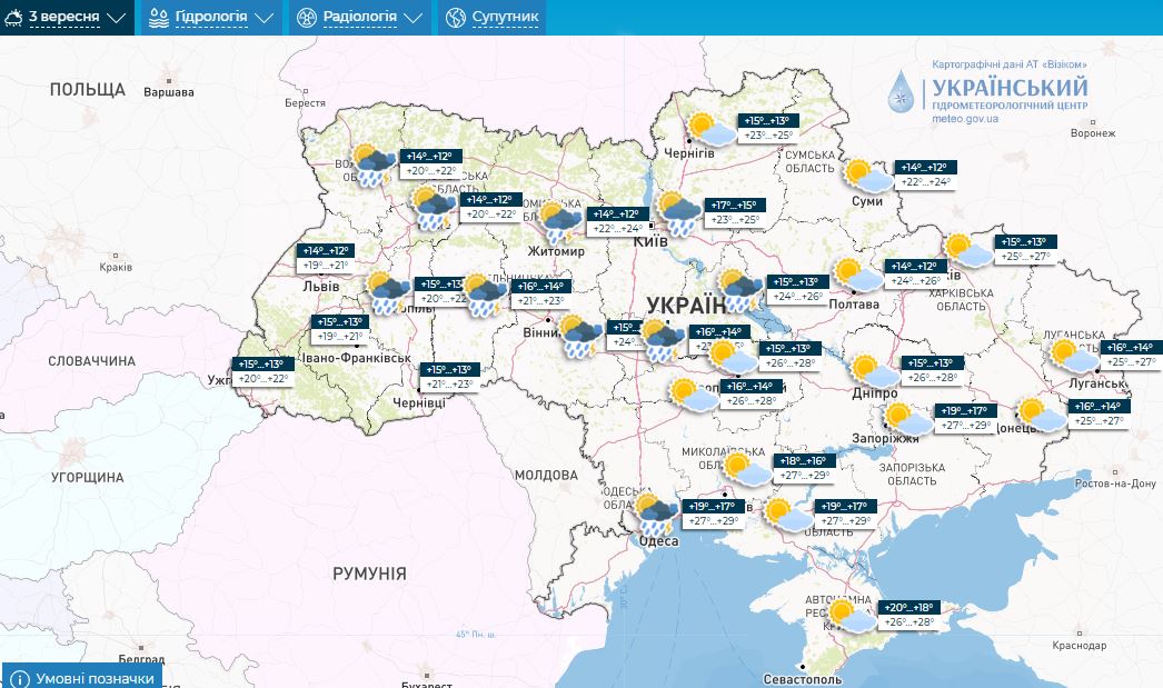 Она предупредила жителей западных регионов о высокой вероятности очень сильных ливней 3 сентября. Дожди также возможны завтра в Житомирской, Винницкой, а также части Киевской областей. На остальной территории страны будет сухо.