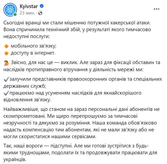 Атака произошла утром 12 декабря. В результате нее абоненты "Киевстара" временно потеряли доступ к услугам связи, включая мобильную связь, Интернет, телевидение и платежные сервисы.