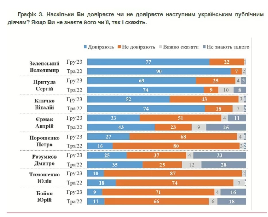 По результатам опроса, проведенного КМИС в начале декабря 2023 года, украинцы больше всего доверяют президенту Владимиру Зеленскому. Его рейтинг доверия составляет 77 %. На втором месте находится телеведущий и волонтер Сергей Притула с рейтингом доверия 69 %. Третье место занимает мэр Киева Виталий Кличко с результатом 52 %.
