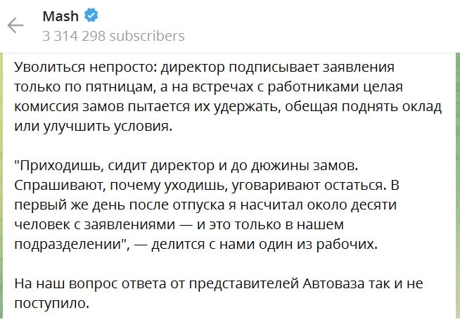 В России на фоне проблем на крупнейшем автопредприятии страны работники "АвтоВАЗа" массово увольняются. После введения новых условий труда зарплаты работников рухнули на 50% (сразу минус половина оклада). Резкое сокращение зарплат вызвало массовое бегство сотрудников, сообщает Mash.