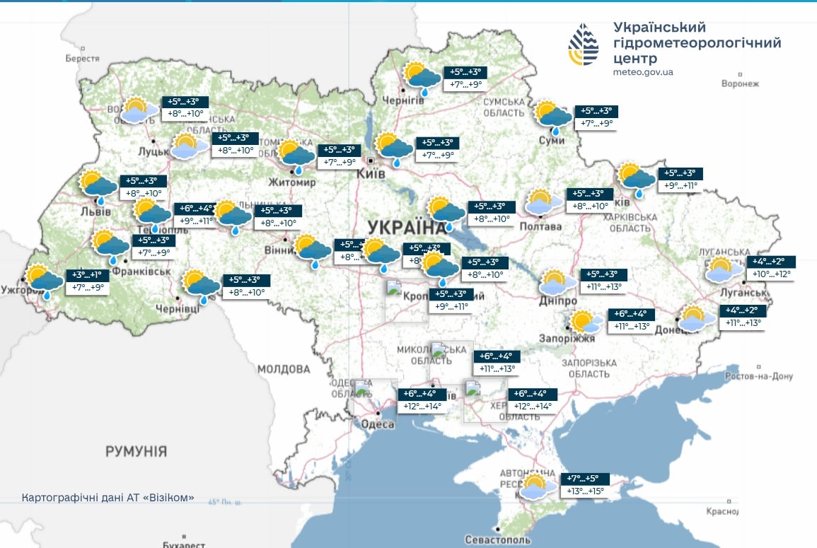 Практически по всей стране ожидаются небольшие дожди. На крайнем севере местами возможны умеренные осадки. Южные области, включая Одессу, Херсон и Крым, останутся под влиянием сухого антициклона — там сохранится переменная облачность и относительно теплая погода.