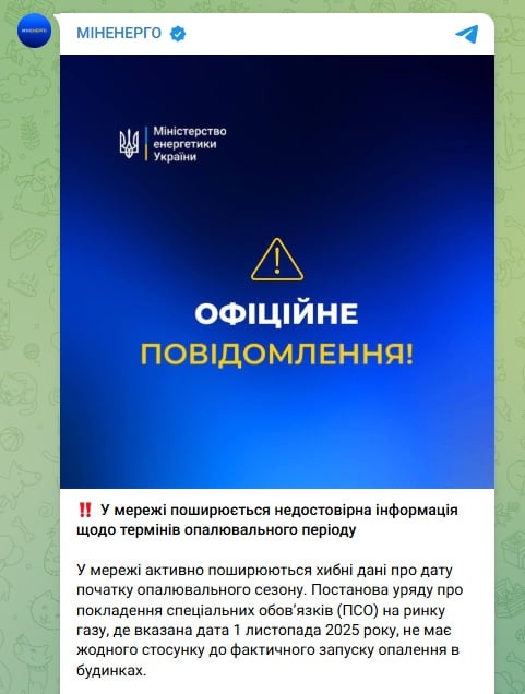 "Постановление правительства о положении специальных обязанностей на рынке газа, где указана дата 1 ноября 2025 года, не касается реального старта подачи тепла. Это лишь технический термин, нужный для расчета фиксированных цен на газ", — подчеркнули в министерстве.