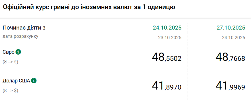 Украинский Национальный банк зафиксировал новый максимум курса доллара с начала 2025 года. Согласно официальным данным, 24 октября курс установлен на уровне 41,9969 гривны за доллар, что на 9 копеек выше показателя предыдущего дня. Последний раз доллар стоил дороже в январе: тогда курс составлял 42,0195 гривны.