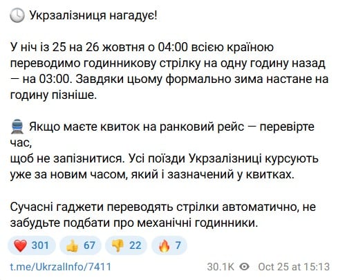 В пресс-службе "Укрзализныци" отметили, что в ночь с 25 на 26 октября в 04:00 все часы в Украине будут переведены на час назад – на 03:00.