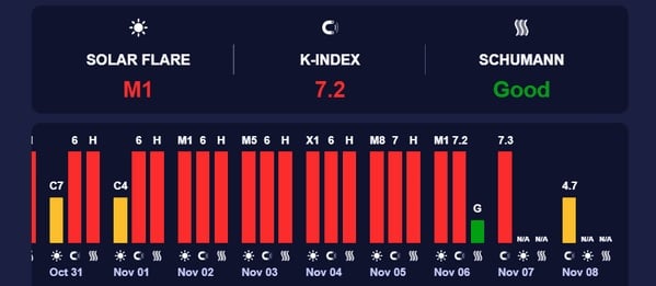 По данным ученых, активность Солнца в ночь на 6 ноября была высокой: произошли две вспышки класса X и одна класса M, каждая из которых сопровождалась выбросами корональной массы. Некоторые из этих потоков, как предполагают эксперты, могут достигнуть Земли, усиливая геомагнитную нестабильность.