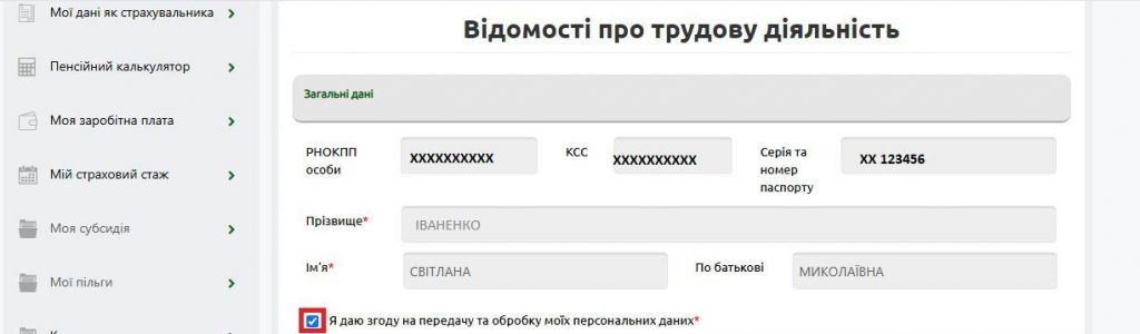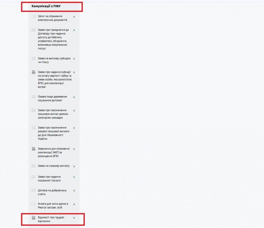 После авторизации нужно перейти в раздел "Комунікації з ПФУ" и открыть вкладку "Відомості про трудові відносини".