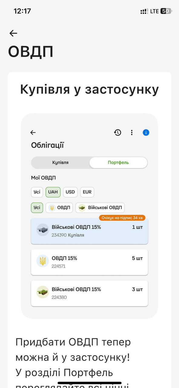 ПриватБанк сообщил, что в приложении появился новый раздел "Облигации". Через него можно выбрать нужный выпуск ОВГЗ, подписать документы через SmartID и оформить покупку или продажу в любое время суток: сервис работает 24/7.