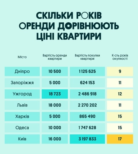 По итогам анализа "OLX Нерухомість" вторичного рынка недвижимости в крупных городах Украины, в среднем расходы на аренду за 12—14 лет достигают стоимости квартиры, при этом самые доступные условия для аренды и сравнительно быстрая окупаемость наблюдаются в Днепре, а наиболее дорогие квартиры, требующие гораздо более длительного периода сравнения с суммарными арендными платежами, характерны для Киева.