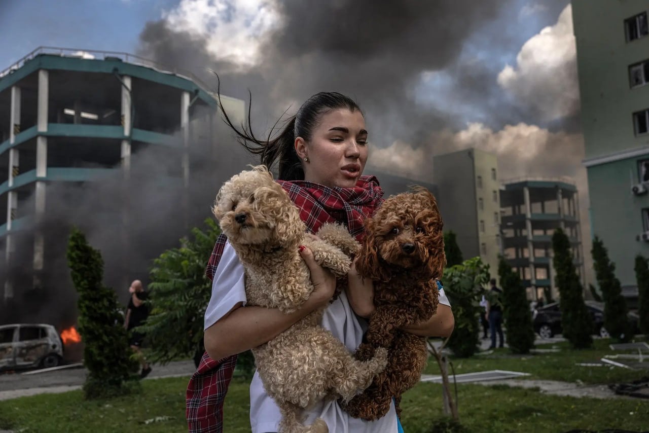 На одном из них жительница Харькова выбегает из дома с домашними животными, спасаясь от российской бомбардировки 24 июля этого года.